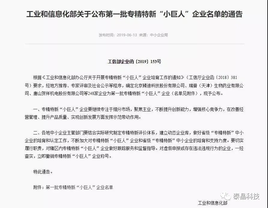 早在2019年6月13日,作為專注于石英晶體元器件細(xì)分領(lǐng)域的龍頭企業(yè),泰晶科技成功入選國家第一批專精特新“小巨人”企業(yè)。