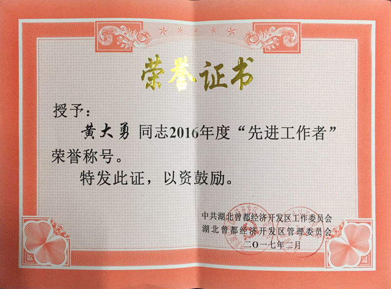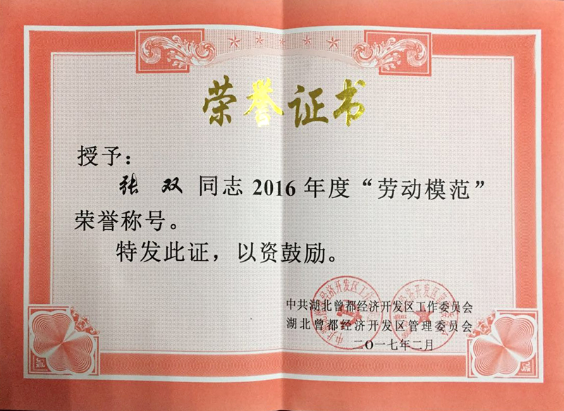 近日,我司被中共湖北曾都經(jīng)濟(jì)開發(fā)區(qū)工作委員會、湖北曾都經(jīng)濟(jì)開發(fā)區(qū)管理委員會評為2016年度“優(yōu)秀單位”;我司員工黃大勇被評為“先進(jìn)工作者”,焦斌、張雙被評為"勞動模范"。