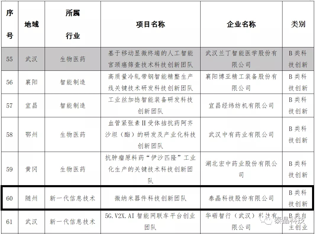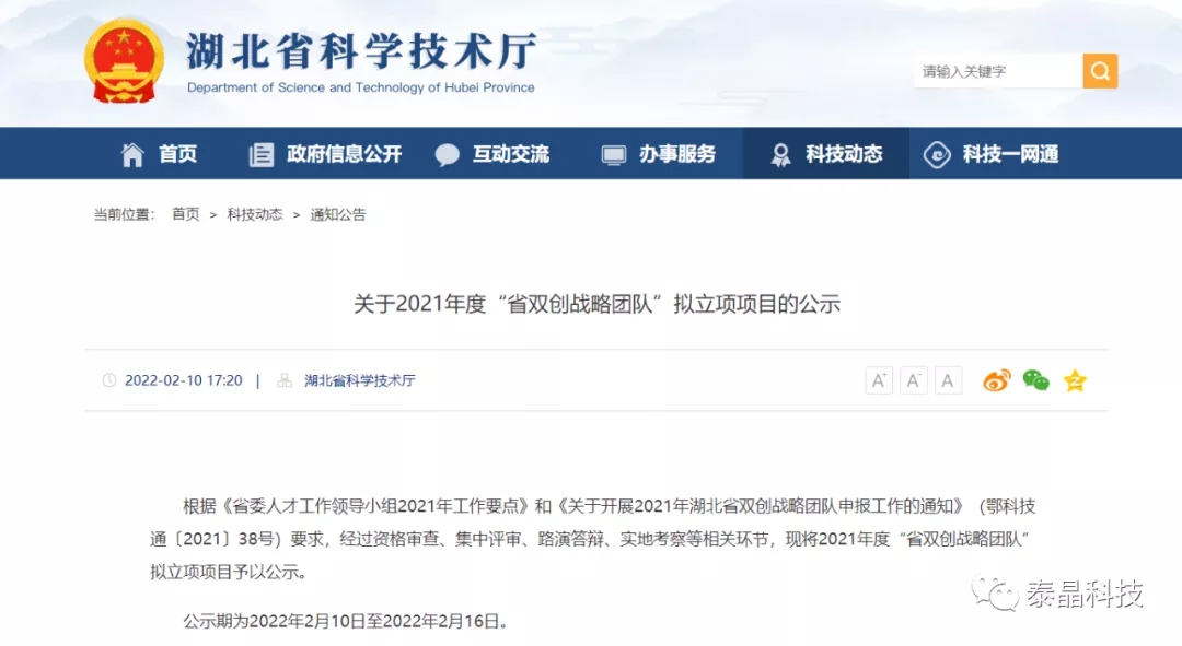 2022年2月10號,湖北省科技廳公示“省雙創(chuàng)戰(zhàn)略團隊”,泰晶科技“微納米器件科技創(chuàng)新團隊”再次榮獲湖北省雙創(chuàng)戰(zhàn)略團隊稱號,并由C類晉級為B類,全省僅15家企業(yè)獲得該榮譽,省科技廳將對創(chuàng)新團隊科技項目給于資金支持,是對泰晶科技人才建設與科技創(chuàng)新工作的支持與肯定。