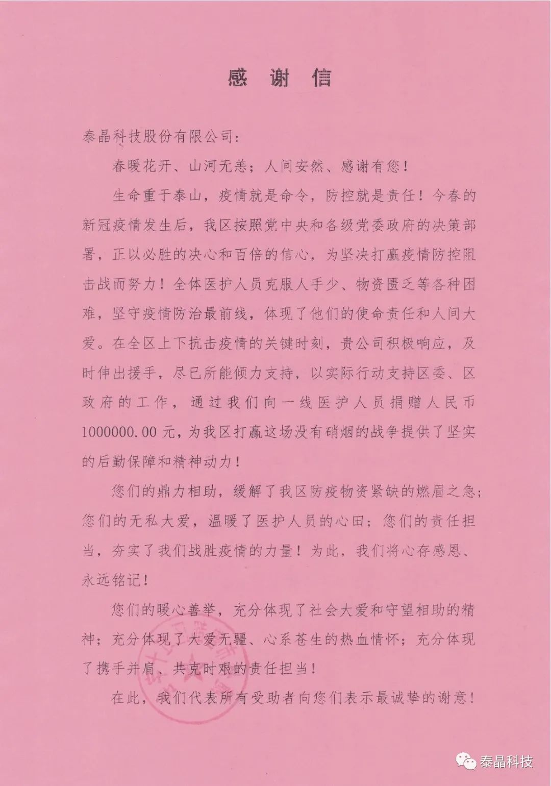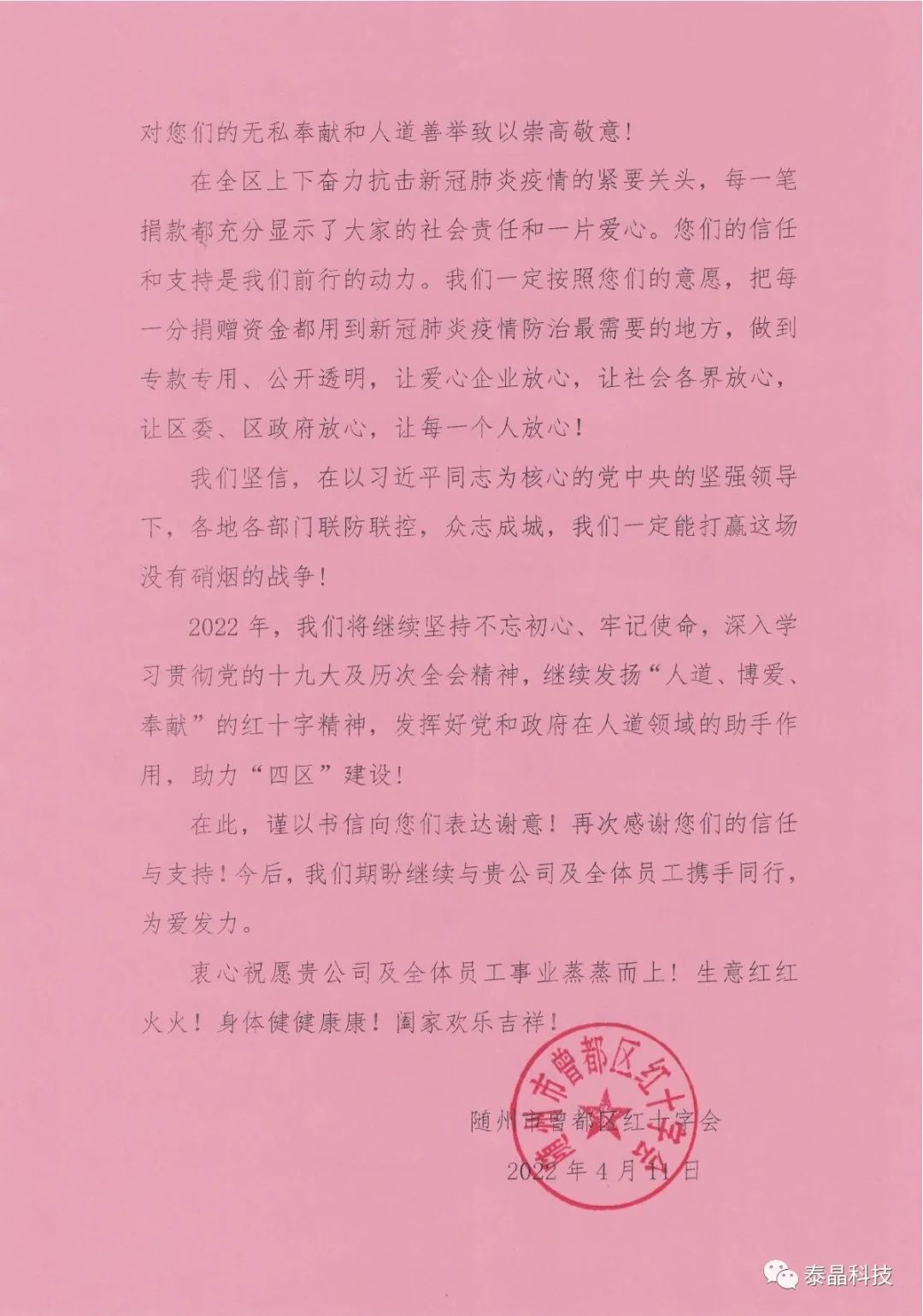 抗擊疫情,眾志成城。2022年4月初,泰晶科技向曾都區(qū)紅十字會捐贈疫情防控專項資金1000000元,用實際行動助力隨州市疫情防控工作,并于近日收到來自曾都區(qū)紅十字會的感謝信。