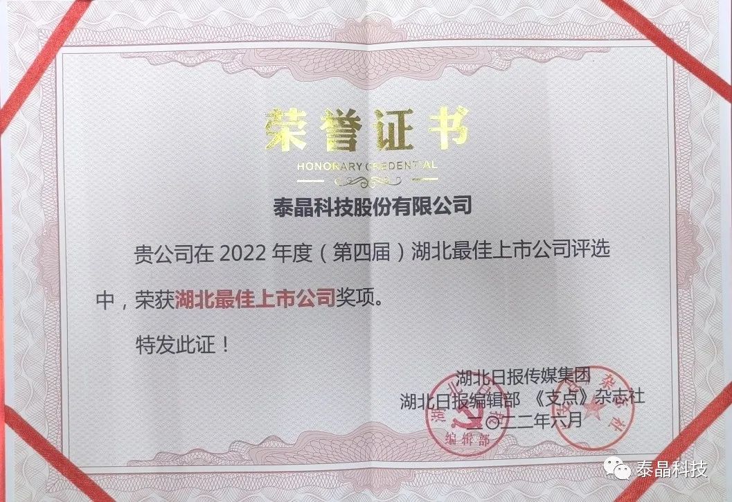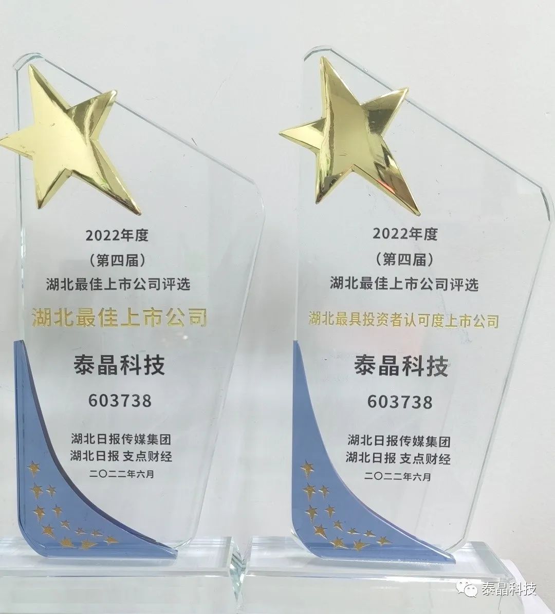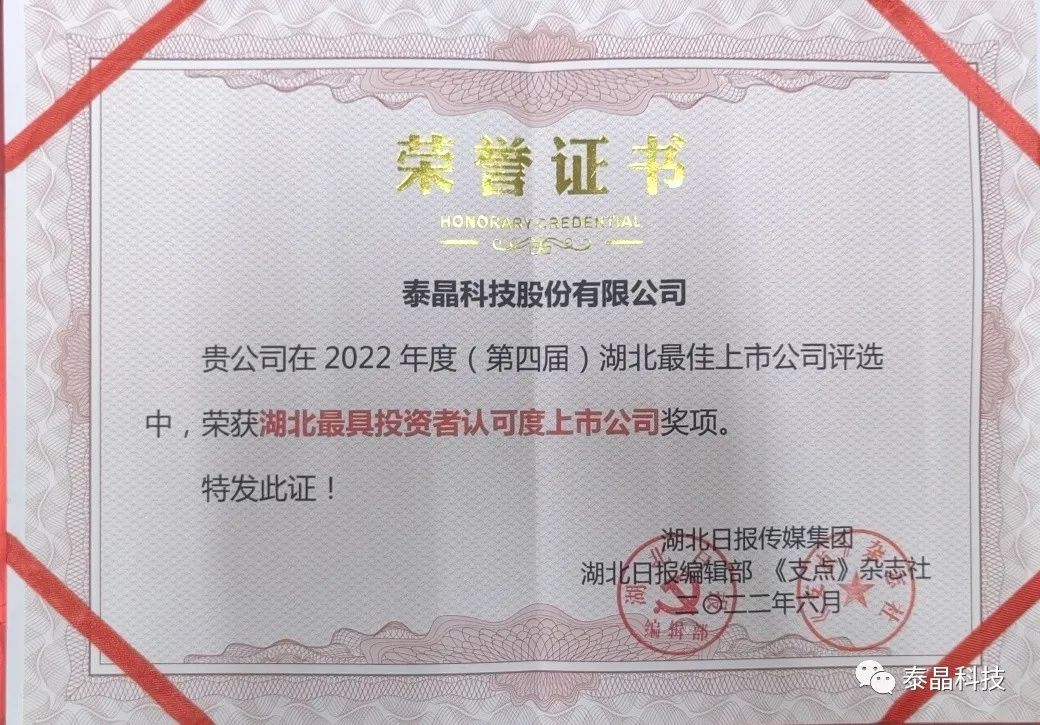 6月28日,中部崛起高質(zhì)量發(fā)展高峰論壇暨2022年度(第四屆)湖北最佳上市公司評選頒獎盛典,在華中之巔武漢綠地中心“長江會客廳”圓滿舉行。泰晶科技等10家公司榮登湖北最佳上市公司榜單。此外,公司還獲評“湖北最具投資者認(rèn)可度上市公司”。