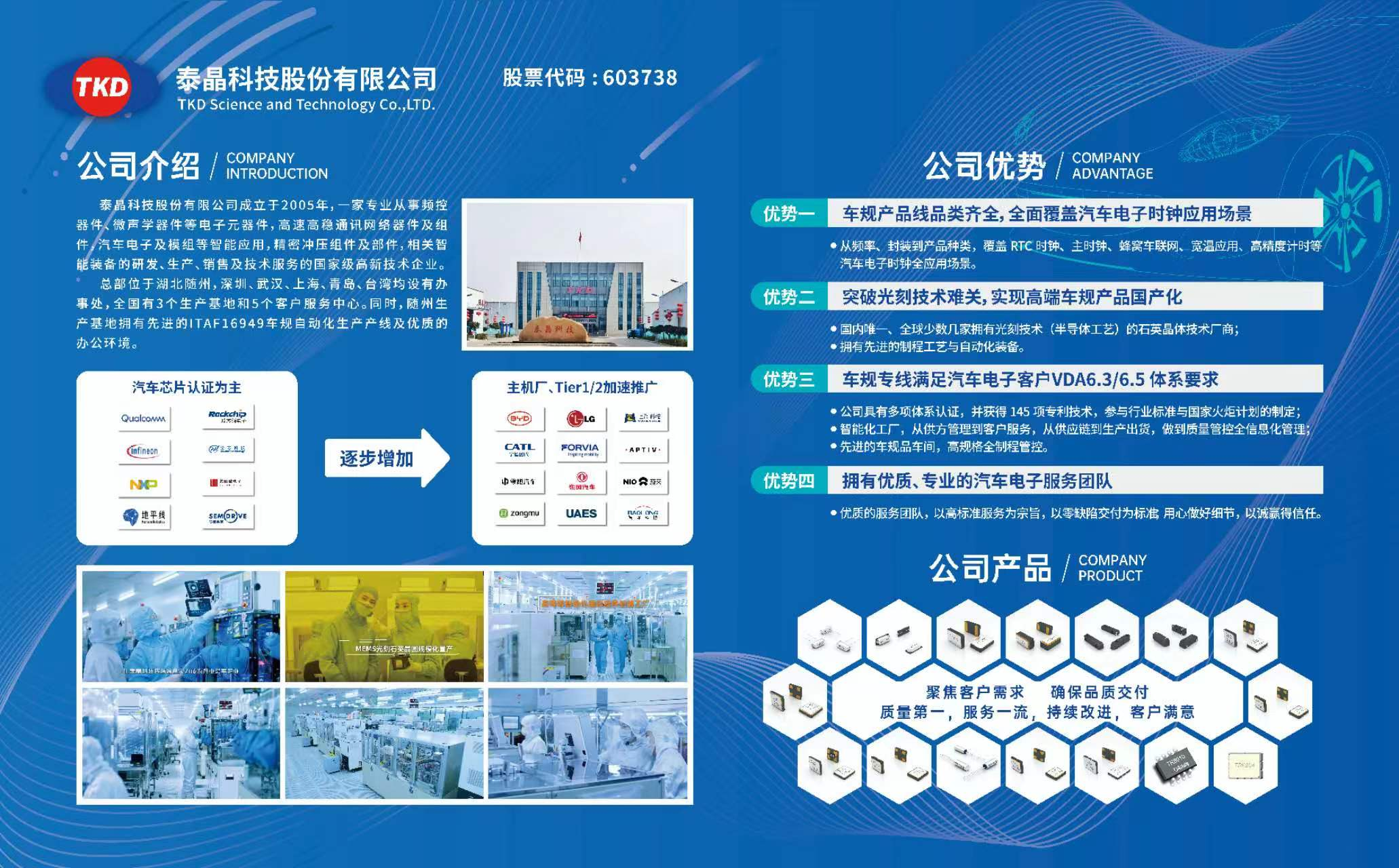 泰晶科技通過了Ecovadis、D&B 鄧白氏全球供應鏈的可持續(xù)性與社會責任評級認證,獲得車載IATF16949、VDA6.3/6.5、AEC-Q200和AEC-Q100等多項車規(guī)體系認證。并成立了車BU團隊,以零缺陷交付為標準,從頻率、封裝到產(chǎn)品種類,覆蓋 RTC 時鐘、主時鐘、蜂窩車聯(lián)網(wǎng)、寬溫應用、高精度計時等汽車電子時鐘全應用場景,實現(xiàn)高端車規(guī)產(chǎn)品國產(chǎn)化。
